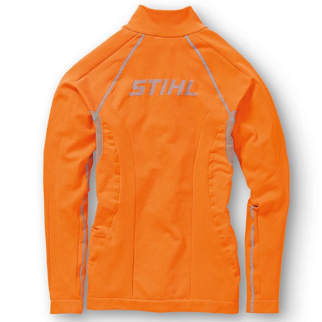 Funktionsshirt, Langarm. Hohe Sichtbarkeit, Reißverschluss, Daumenschlaufe, Rippenstruktur polstert Schultern, Ellenbogen undUnterarme. Farbe Warnorange